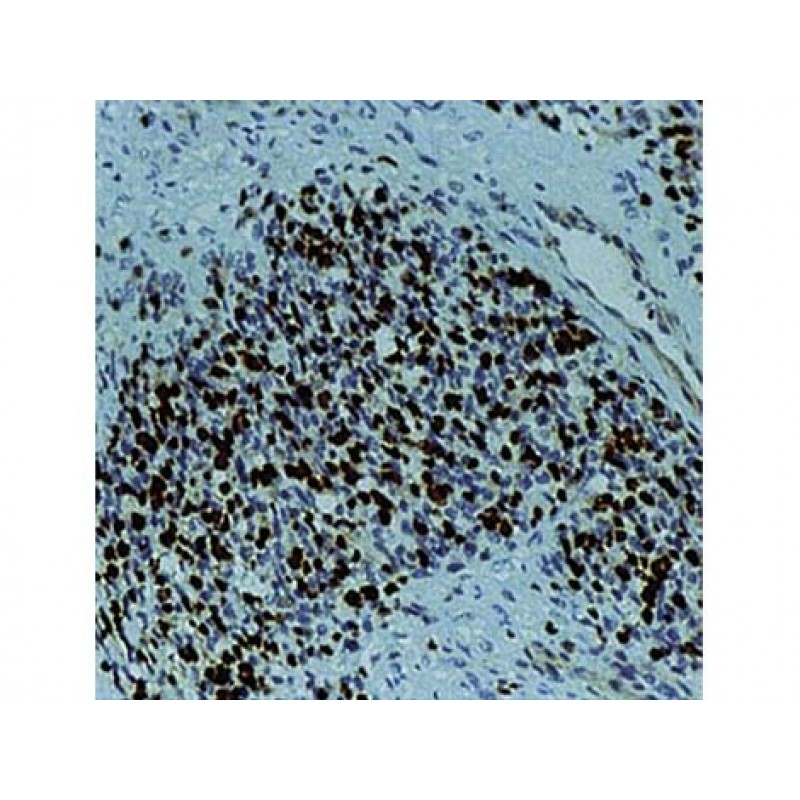 Specificity: This antibody is specific to 34 kDa protein known as myogenin. Myogenin is a member of family of myogenic regulatory genes which includes MyoD, myf5 and MRF4. These genes encode a set of transcription factors which are essential for muscle development. Expression of myogenin is restricted to cells of skeletal muscle origin. This antibody cross-reacts with mouse, rat, and cat.