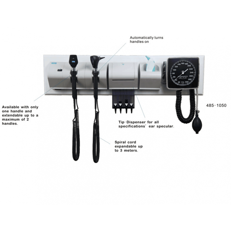 Set complete with:3.5V Coaxial Ophthalmoscope,3.5V Fiber Otoscope,485 wall mount transformer with handles,Specula dispenser, Ear Therometer, Sphygmomanometer, Power cable with Plug, Wooden plate (Medium size), Carton Box.